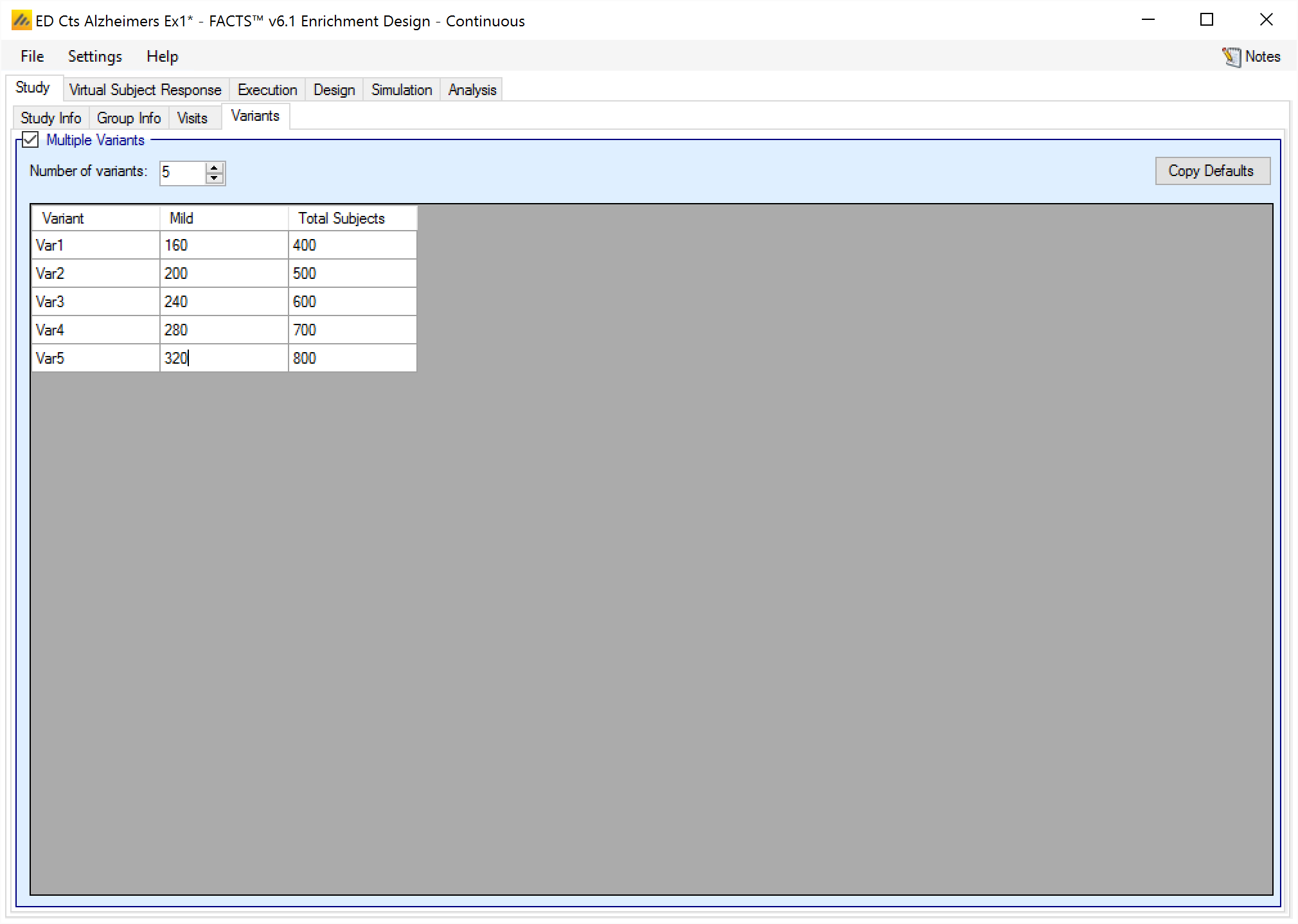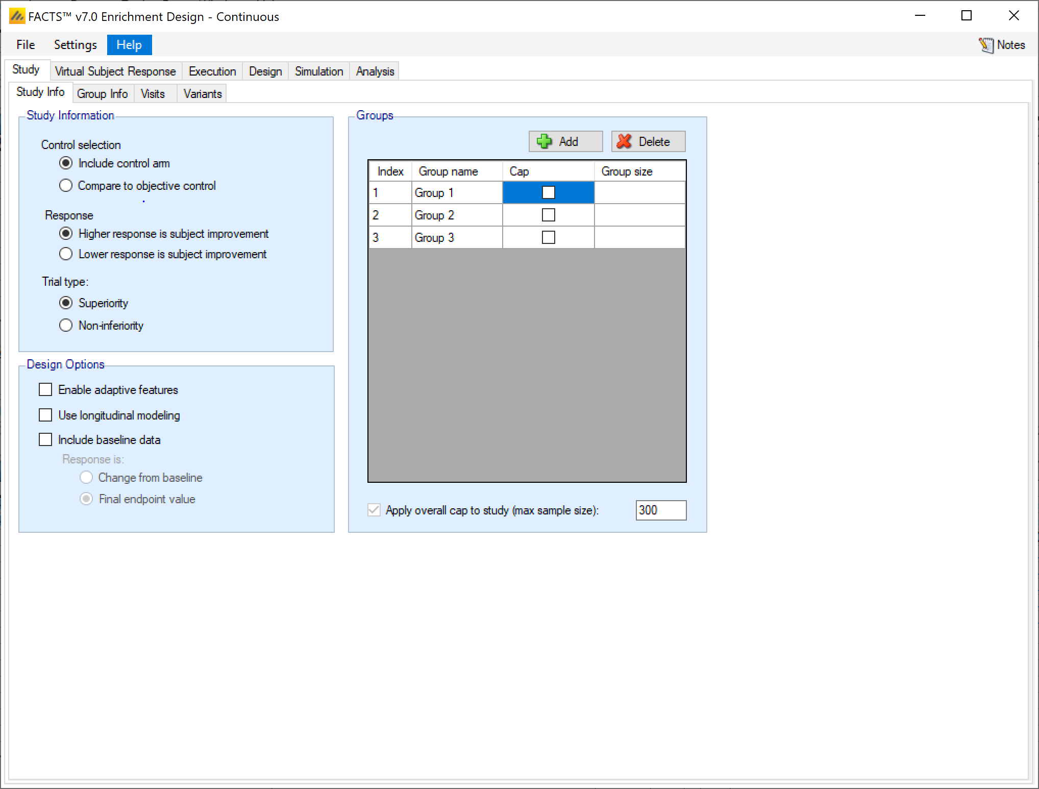 The user enters the number of variants they wish to create. Then in the resulting table, enter different maximum subjects for each group that has had a cap specified on the Study > Study Info tab and maximum “Total Subjects” for each variant. On the simulations tab FACTS will then create a copy of all the scenarios to run with each variant.