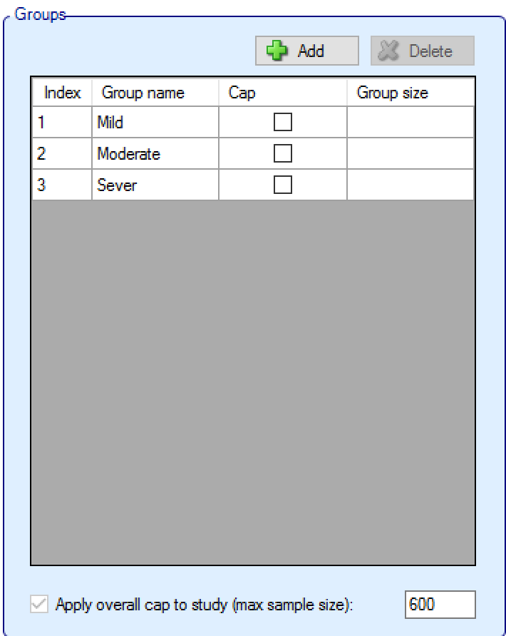 The groups’ names edited to something meaningful for the trial and it is possible to specify whether there is a ‘cap’ on the number of subjects that can be recruited into that group, if so then the ‘Group size’ must be specified.