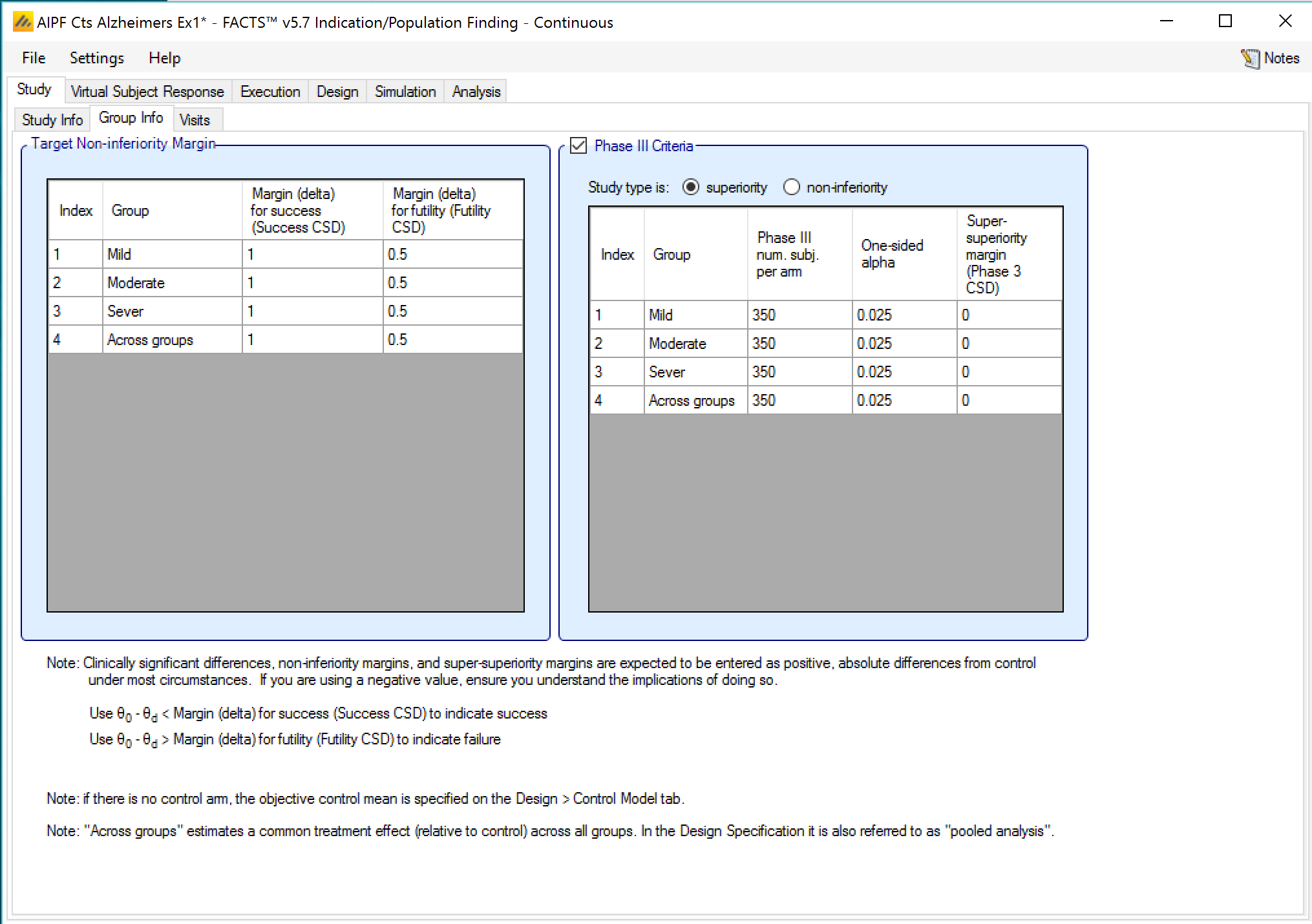 In a trial to show superiority, for each group the Target mean difference for success and Target mean difference for futility may be specified, these are referred to as the CSDs (Clinically Significant Differences). Optionally the parameters for a phase 3 may be to allow the predictive probability of subsequent success in such a phase 3 trial to be used as decision criteria.