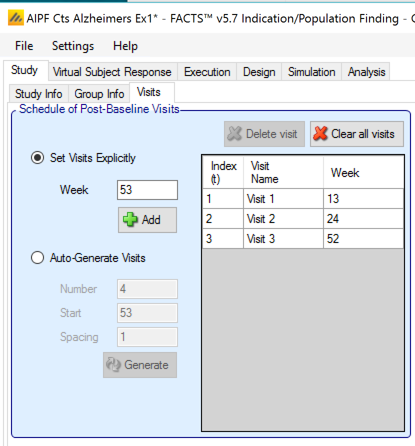 Otherwise the visit schedule needs to be specified. The last visit in the schedule is taken to be when the final endpoint is observed. Visits can be specified one at a time by entering the week of the visit and then clicking ‘Add’, or by specifying a regularly spaced sequence: select ‘Auto-Generate’, enter the number of visits, the week of the first visit and the number of weeks between each visit and then click ‘Generate’.