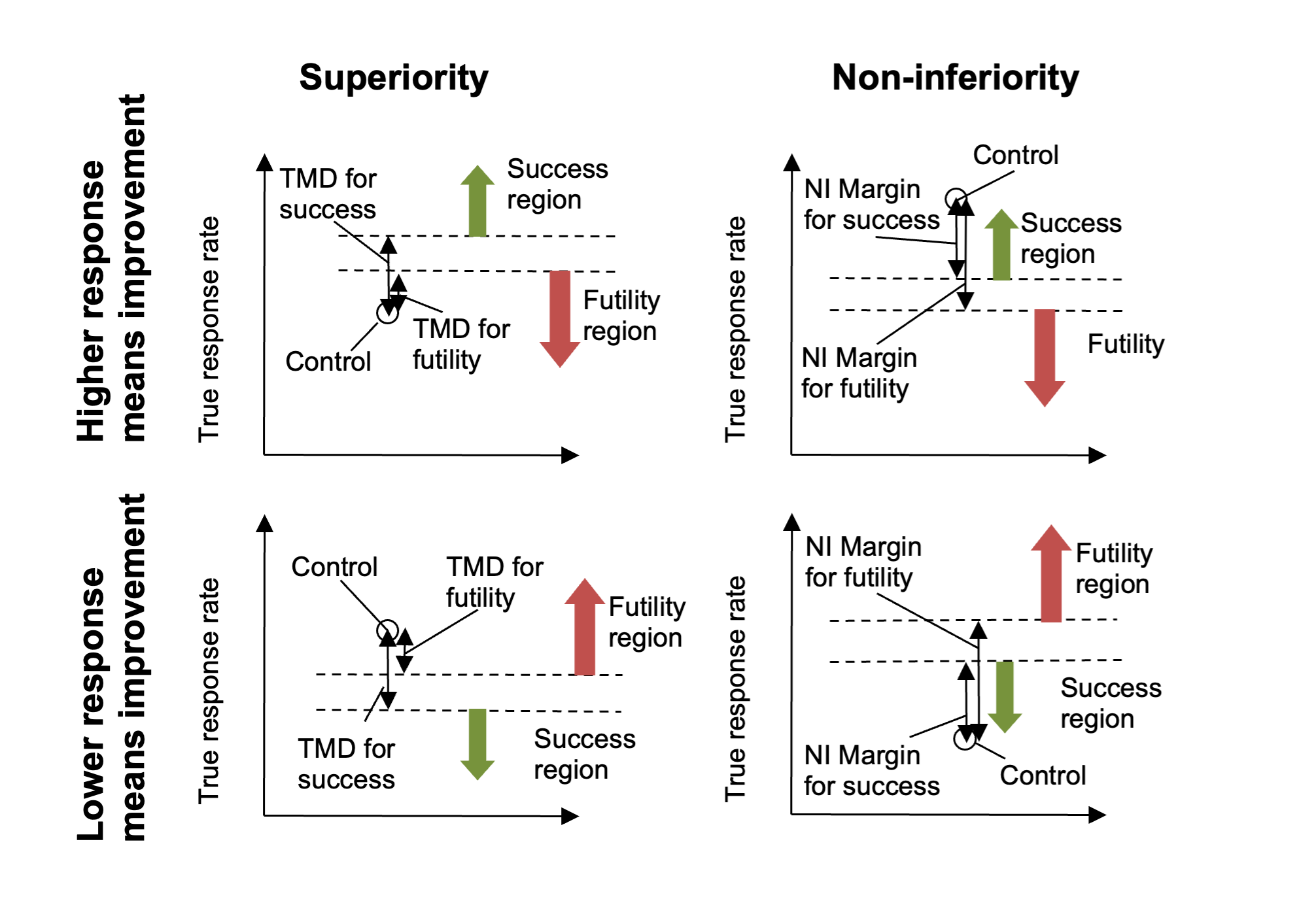 Note that in Superiority trials the required TMD for success will be greater than or equal to the TMD for futility, whereas in the Non-Inferiority trials the required NIM for futility will be greater than or equal to the NIM for success.
