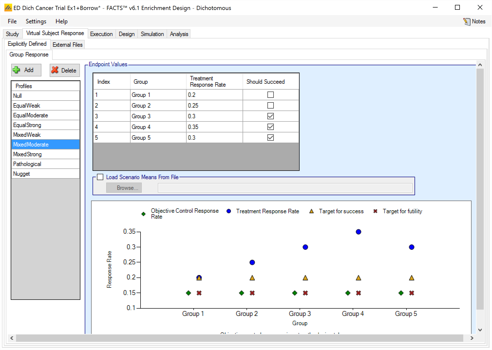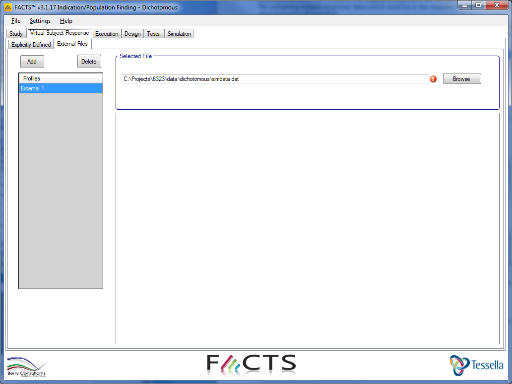 As well as simulating subject response within FACTS they can be simulated externally, from a PK-PD model for instance, and imported into FACTS, and the supplied responses are sampled from (with replacement) to provide the subject responses in the simulation. The specification of a file containing subject response data (which must be in the required format) can be done from the External Files sub-tab depicted below.