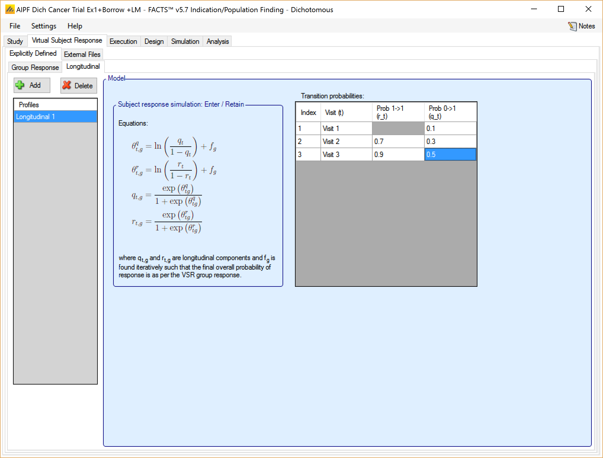 Click here for an overview of longitudinal models for dichotomous endpoints in the FACTS Core engine.