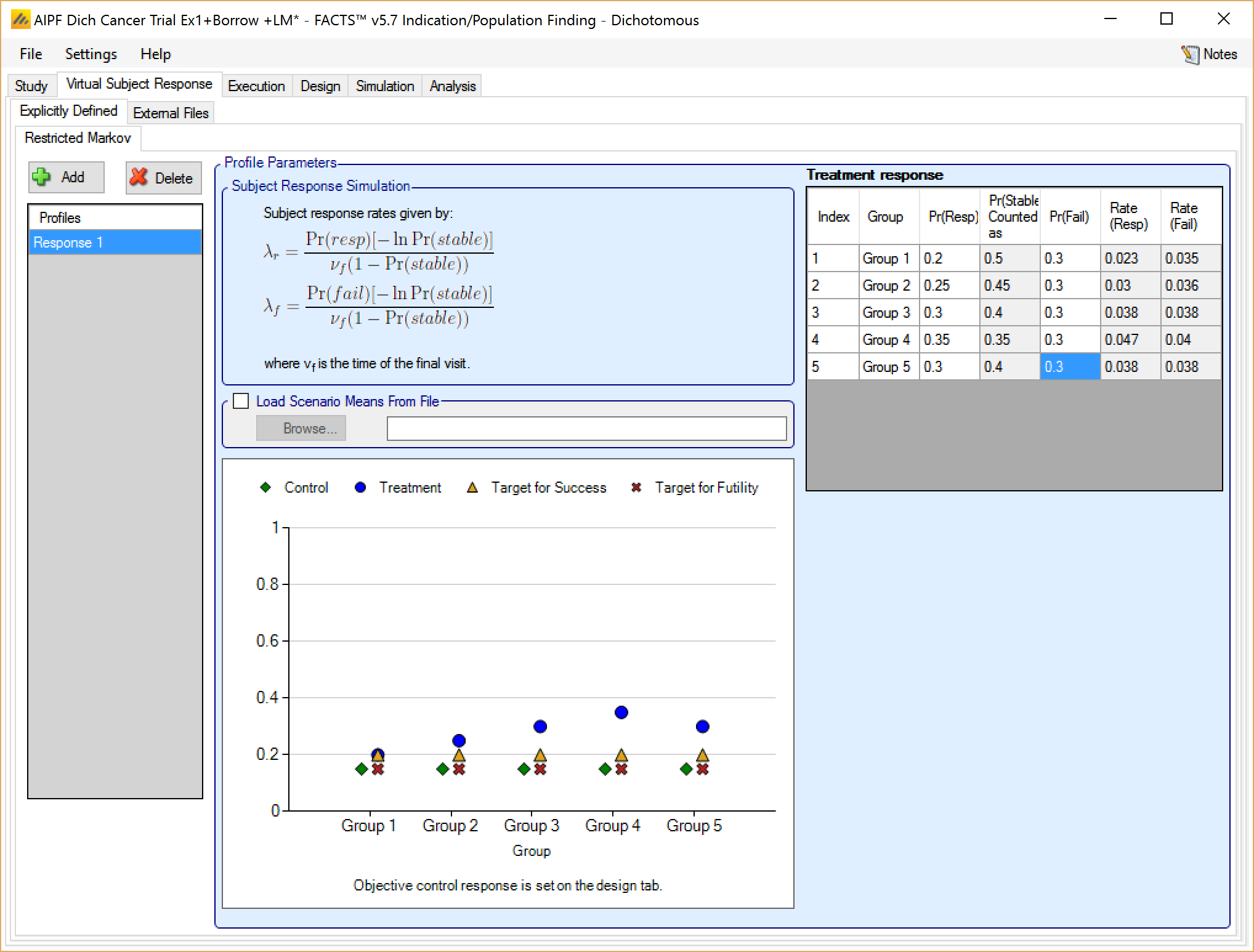 If the restricted Markov model was selected on the Study Info tab, the subject simulation method is fully described by the overall probability of response and failure for each group.