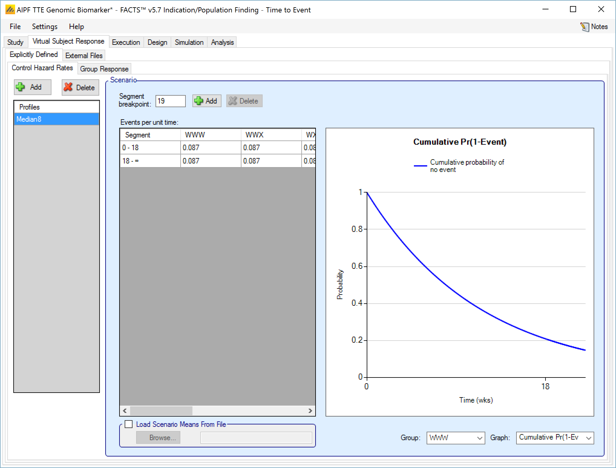 Unlike other endpoints where simply a response (mean change from base line or rate) is specified, specification of subject responses for a time-to-event endpoint is by separately specifying a piecewise exponential event rate for the control population and then hazard ratios for the treatment arms. For simplicity and consistency, this means of specifying the simulated event rates is also used when no control arm is present and the comparison is with historic control rates.