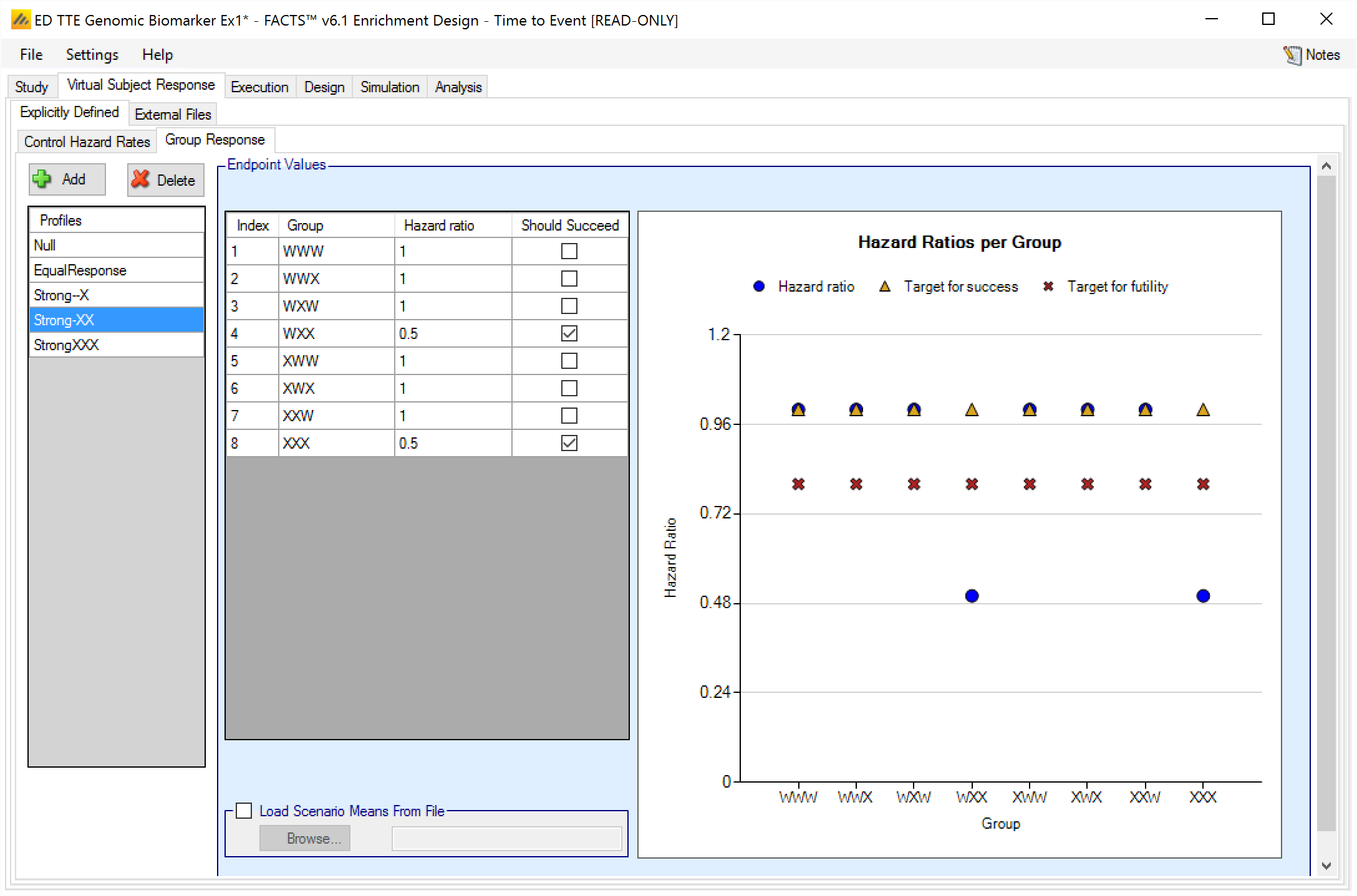 Response profiles may be added, deleted, and renamed using the table and corresponding buttons on the left hand side of the screen in Figure 2. Hazard ratios are entered for the study treatment arm for each group directly into the Hazard ratio column of the table. The graphical representation of these values updates accordingly.