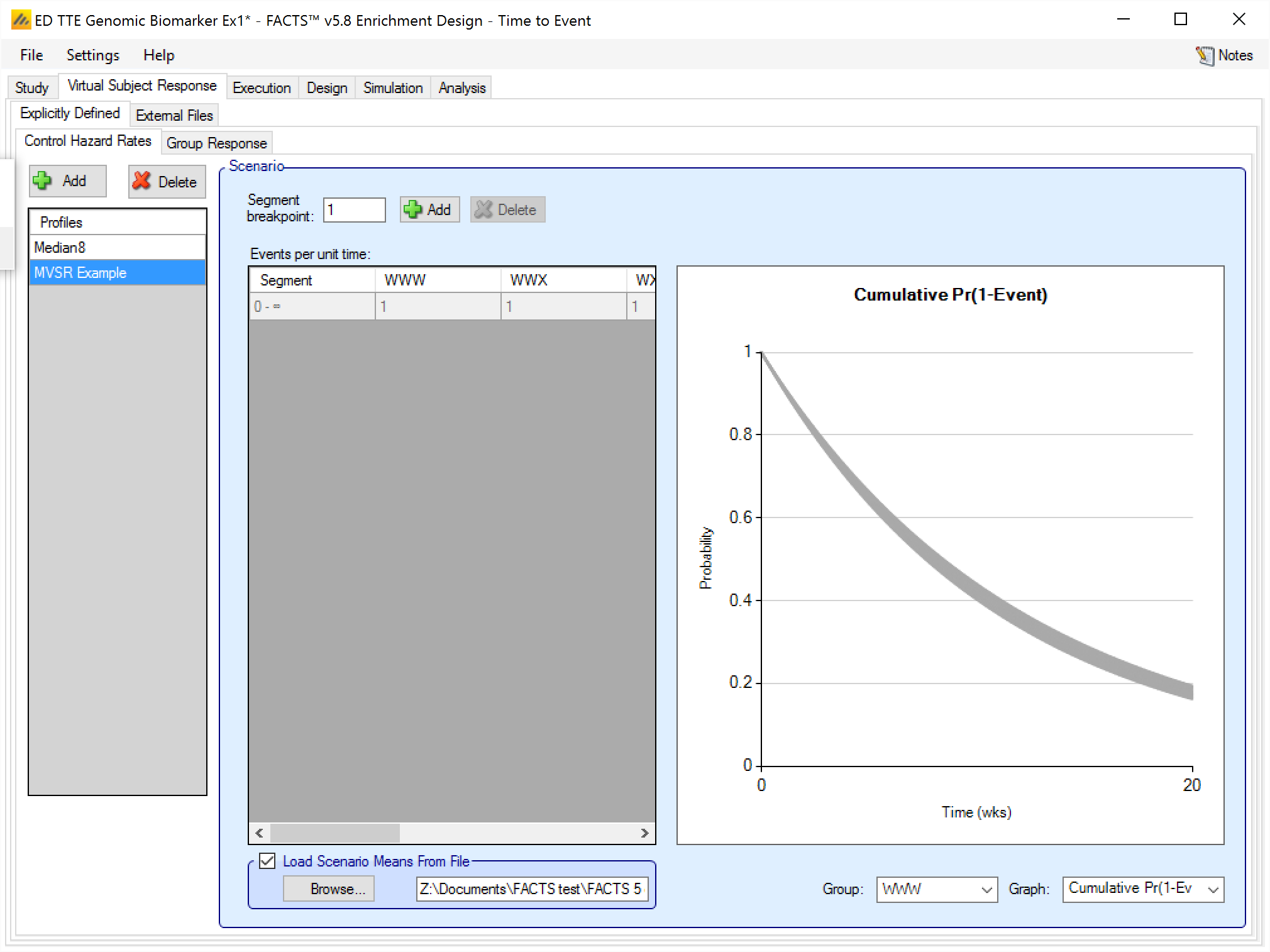 For TTE the user must supply 2 files – one for the Control Hazard Rates and one for the Hazard Ratios in each group. MVSR hazard rates are only combined with MVSR control hazard rates. MVSR hazard rates are only combined with MVSR control hazard rates. The lines from each file are paired up for each simulation, so the first control hazard rate is used with the first group response hazard ratio, the second control hazard rate is used with the second dose response hazard ratio and so on. There must be the same number of lines in each file.