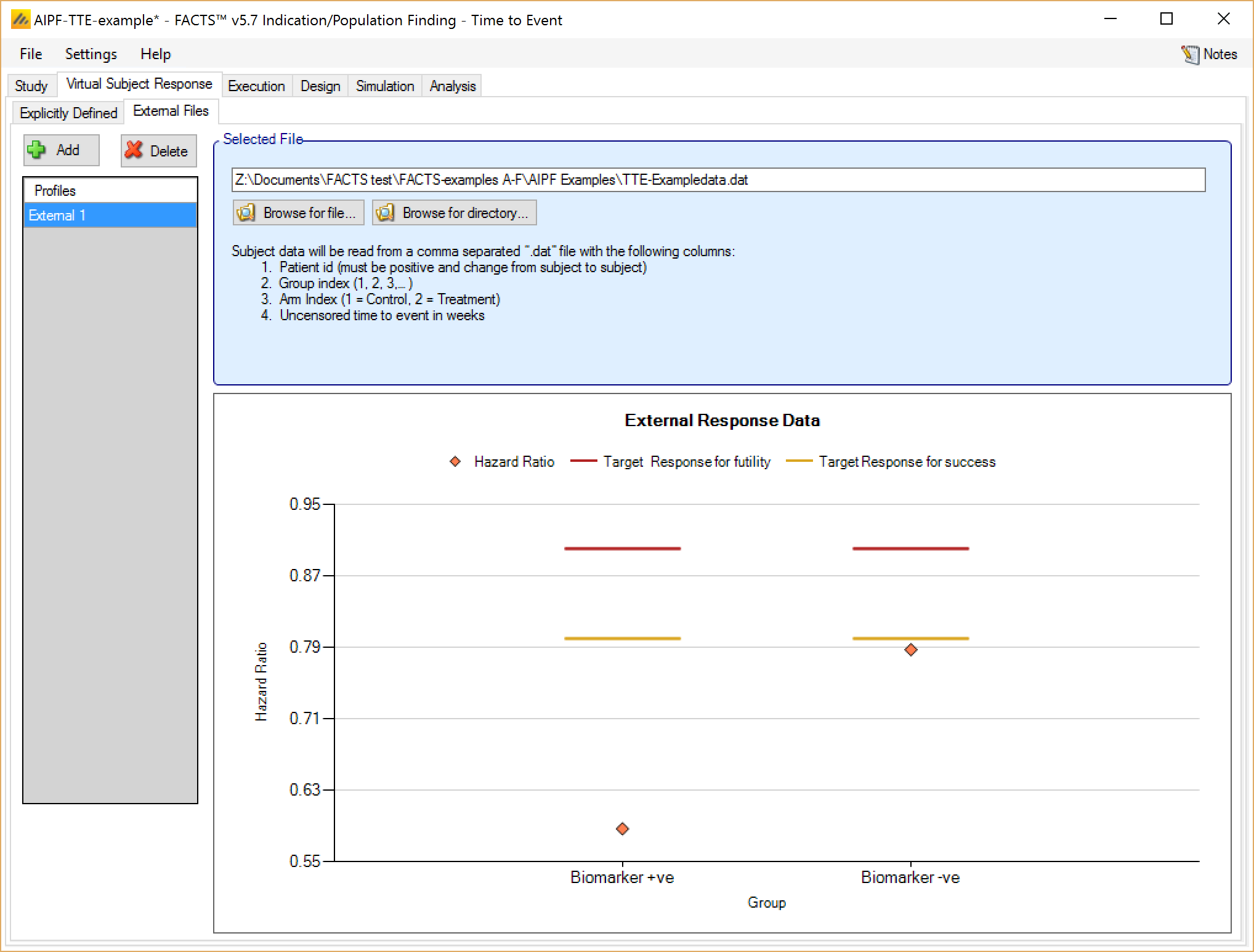 As well as simulating subject response within FACTS they can be simulated externally, from a PK-PD model for instance, and imported into FACTS where the supplied responses are sampled from when simulating the trial. The specification of a file containing subject response data (which must be in the required format) can be done from the External Files sub-tab depicted below.